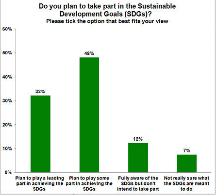 Results from the key question are in the chart below. This shows that almost a third (32 percent) of responders said that they will play a "leading part" in the SDGs, while almost half (48 percent) said they will play some part.