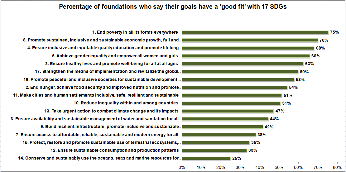 Overall this suggests that there is highly fertile ground for collaboration with foundations and all the SDGs. As one foundation put it: "SDGs is the way to go and we all must work to make it happen." Another suggested: "Foundations have a major role in convening discussion on links between the SDGs and strategies of inclusive and sustainable development — and promoting awareness of these links."