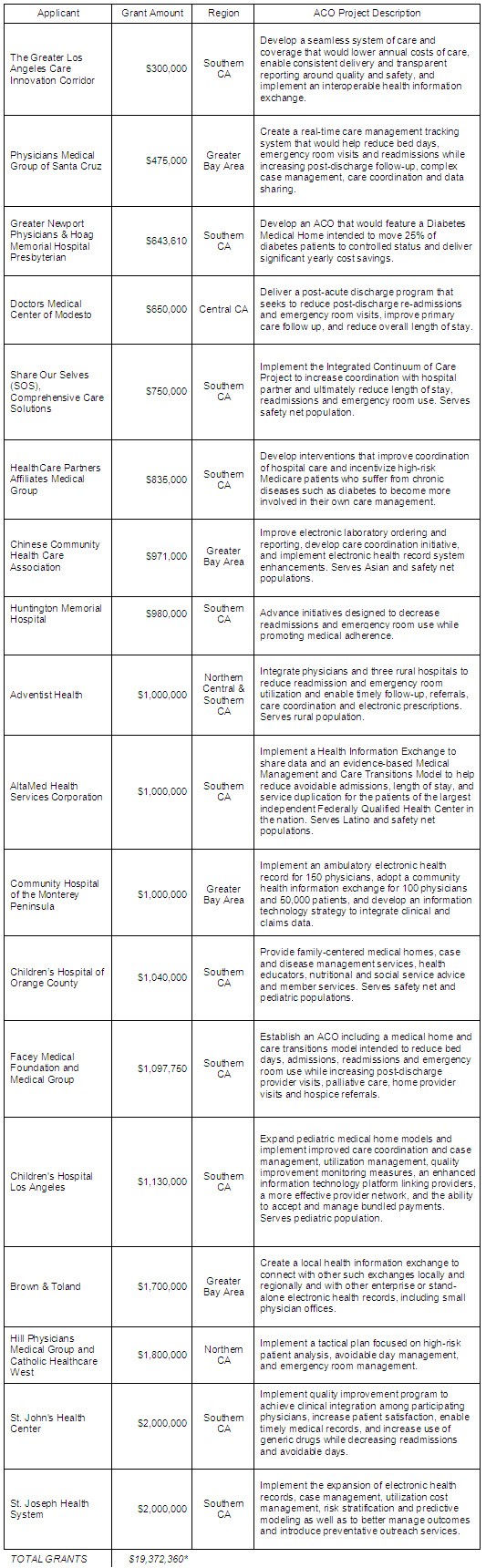 Blue Shield of California has announced grants totaling more than $19 million to eighteen California hospitals, health systems, clinics, and physician groups working to develop accountable care organizations.